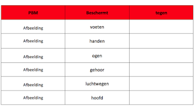 Zoek een afbeelding van de PBM die beschermt tegen hetgeen in de tweede kolom staat en noteer in in de derde kolom uitvoerig waartegen ze beschermen. Om de afbeelding groter te krijgen moet je op de afbeelding klikken.